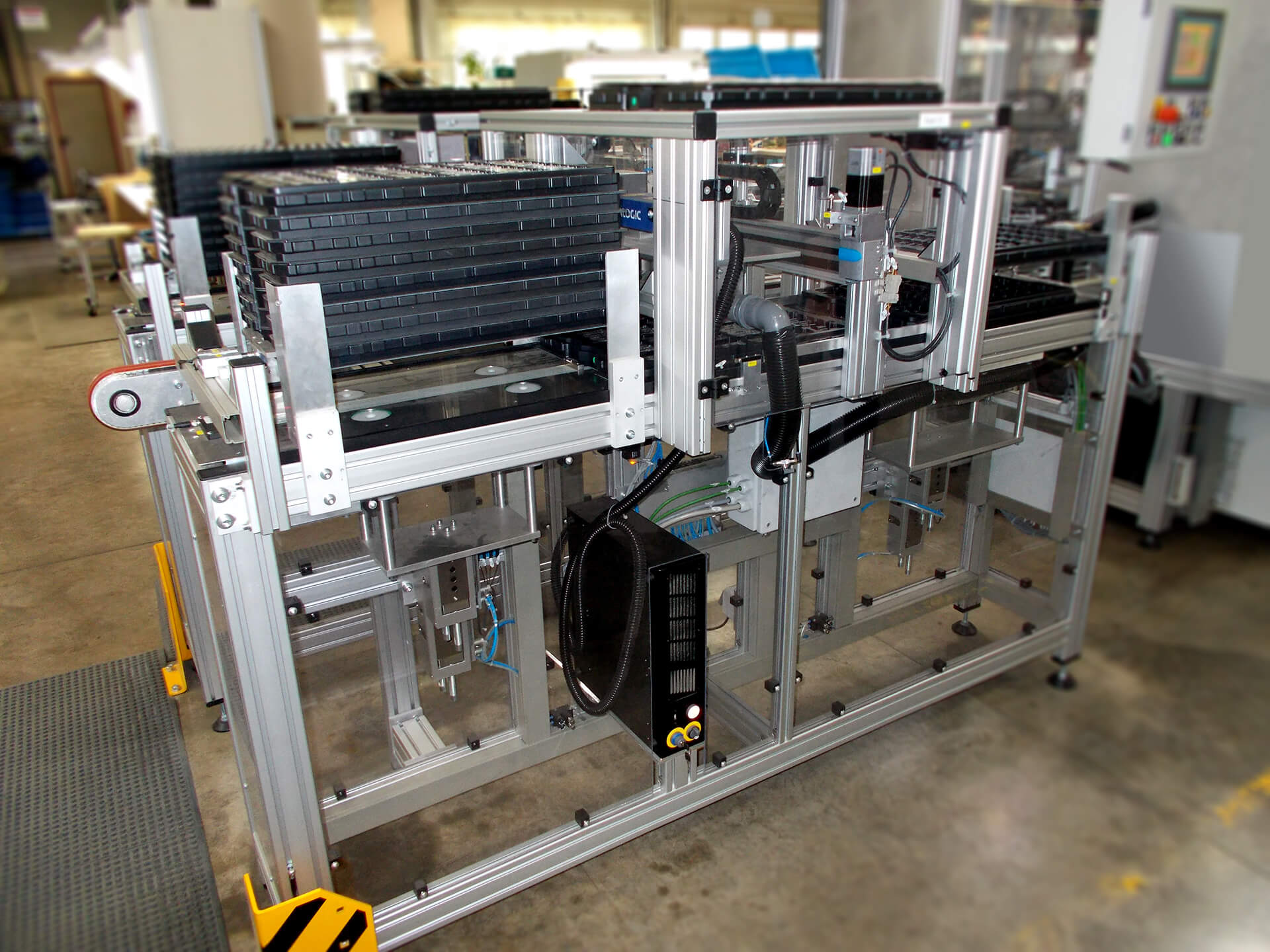 Der Palettierer der SMR Sondermaschinen GmbH arbeitet zurzeit mit einer maximalen Palettengröße von 600 x 400 mm. Oberhalb des Transportbandes werden die Paletten gestapelt und können von Hand entnommen bzw. eingelegt werden. Die Anzahl der vollen und leeren Paletten, welche die Magazine derzeit aufnehmen können, ist auf circa sechs Paletten begrenzt. Zukünftige Erweiterungen und Optimierungen sind vorstellbar.